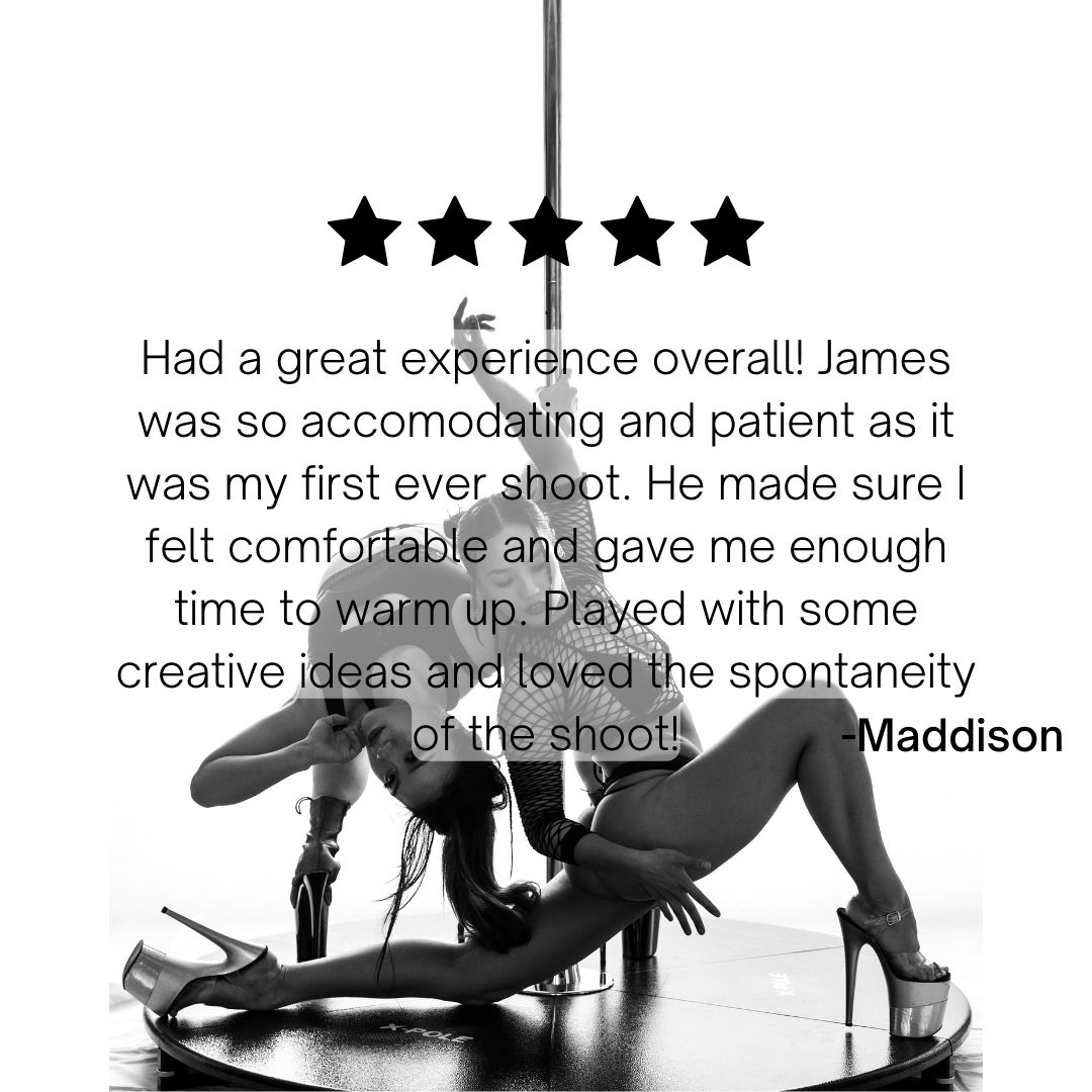 We have a floor to ceiling stainless steel X pole and a stage pole. All equipment is set up properly and tested before your session. We will only shoot tricks that are comfortably within your skillset. If you have specific safety questions, ask before you book.